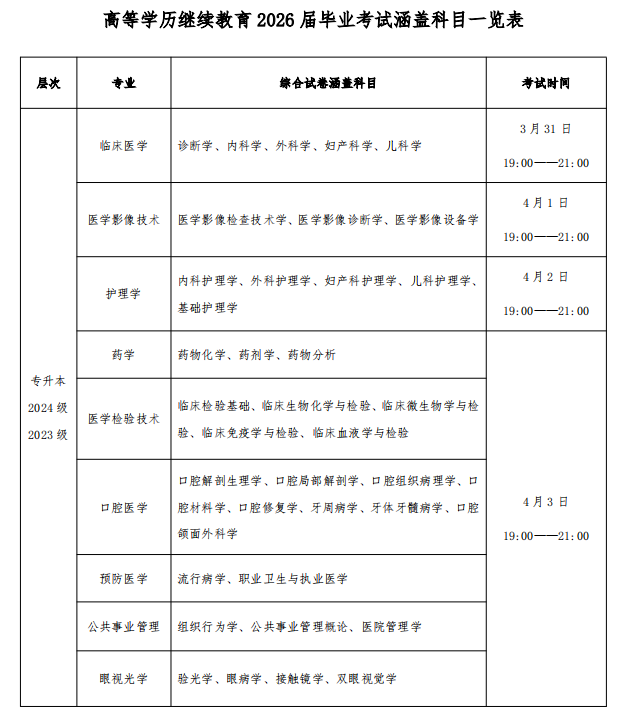 2、考试时间:3 月 31 日——4 月 3 日。毕业考试为综合试卷形式,各专业考试涵盖科目及具体考试时间见下图